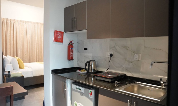 There is a fully equipped kitchenette with a hot pot, water kettle, cooking-ware and a refrigerator. Tea and Coffee Creamer are well stocked.