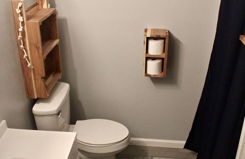 Jack has an assortment of flea market finds scattered about the space. We focused the decor with the all American boy in mind regardless of the state the were from. A handmade farmhouse style table that can comfortably seat 6, or more, sets in the open space in front of some windows. Cedar accents are located in the bathroom which carries a great smell in a small space. There is a bunk room that houses a twin bunk and a twin over full bunk. The other bedroom has a king bed. For your personal convenience we chose to place a washer/dryer in the cottage for you to use.