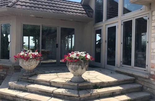 Jett Manor on Elderberry Hill is a scenic estate located high on the bluff with stunning views of the Missouri River Valley. This estate is nestled between an organic Elderberry Farm and the Katy Trail, and is 2 mi. from historic Hermann, MO. This spacious 12K sq ft home provides ample living and dining areas. There is a beautiful great room with a wood burning fireplace, piano room, bar area, sunroom, deck and gazebo. Guests can also enjoy the hot tub, sauna, steam shower and exercise room. The Katy Trail is literally the southern border of the property. Guest may contact us via cell phone any time during their stay with any questions or concerns. The home is part of a 13 acre estate which offers a welcome respite from the hustle and bustle of city life. Guests can expect a quiet and peaceful experience to relax and unwind while being immersed in the surrounding beauty of nature. In addition to the tranquility of the property itself, Hermann, MO. (which is only 5 minutes away) offers a plethora of activities, including wineries, breweries, wedding venues, and many other historic sites. For more information, please check out the official Hermann, MO. Going into town is a very short drive (~5 minutes). Don't feel like driving? The Hermann trolley will pick up guests right in the driveway and take them into town.