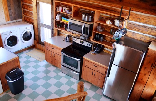 Johnson Creek Cabin is a two level historic cabin. The open plan living area is well-appointed and provides ample of space for everyone in your group. Warm and inviting decor, comfortable leather couches, radiant floor heat, modern farm-style kitchen with stainless steel appliances, dining table with seating for 6 and spacious bathroom with a shower are just a few amenities the main level has to offer.