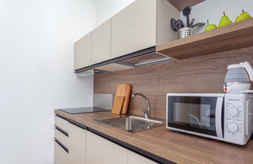 The property has a double Murphy bed and please note the sofa can not be used at the same time when the Murphy bed is made. There is plenty of space for your belongings in the wall cabinet. The dining area consists of a round table and 4 chairs. The open-plan kitchen is equipped with all the necessary amenities, including a fridge, stove, coffee maker (Moka pot), microwave, kettle, and dishwasher. There is an enclosed shower and bidet in the bathroom.