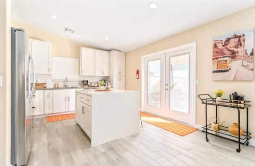 Welcome to our Desert Oasis, a turn-key, impeccably remodeled home in the peaceful Indian Cove community, steps away from Joshua Tree National Park. This home offers a perfect blend of modern amenities and serene desert living. Inside, you'll find a spacious, open-plan living area with ceramic tile flooring and recently renovated kitchen and bathrooms. The chef's kitchen features quartz countertops with a waterfall island and new, high-end stainless appliances.