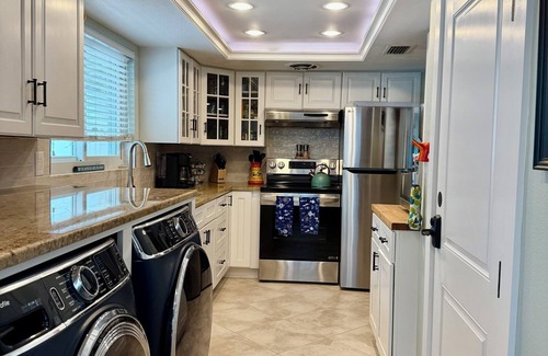 Modern comforts of the 1,465 square foot cottage include a new kitchen with Granite counter tops, tile back splash, new stainless appliances, new front loader washer and dryer.