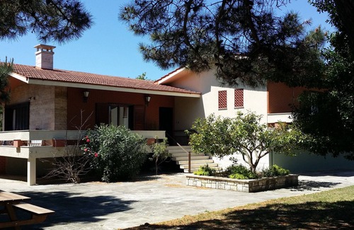 With its own sandy beach, this large seafront house (160 m2) with its surrounding Mediterranean fruit grove (6,000 m2), is ideal for a relaxing holiday. 3 large bedrooms, 2 bathrooms and a large living room can sleep 6 people. With the beach in front of the sea-door you can swim anytime, from dawn till night, in the crystal clear waters of the Ionian Sea and return for a shower. In the spacious verandas of the house you could take your breakfast, enjoy the sea-view, hide from the sea-breeze, enjoy the sun, have your favourite drink while watching the sunset, etc. Full kitchen amenities, laundry, internet, air-conditioning when needed, spacious garden.