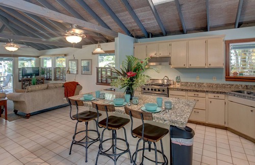 Upstairs, you’ll find the living room, kitchen and two bedrooms. There are ocean views from every room here. The large kitchen has everything you could possibly need or want to cook up those delicious island meals. The upstairs lanai has outdoor dining for 6 and is the perfect place to have coffee in the mornings.