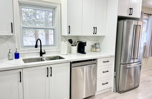 Cottage stocked with: linens, bath towels, cleaning supplies, garbage bags, toilet paper, paper towels, glassware, mugs, tableware, pots/pan, utensils, coffee, sugar, salt/pepper and a few other cooking/kitchen necessities. The kitchen range hood is charcoal filtered, designed for light cooking only.