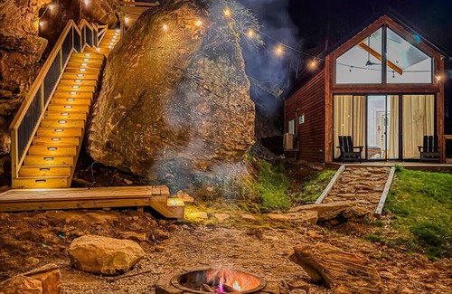 ☀ Cliff-top hot-tub cabin on a giant boulder with stargazing platform built into the cliff