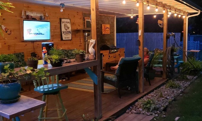 The cottage is a relaxed coastal theme with a covered patio being a Key West themed area with a TV, Mini frig, picnic table and conversation sitting area.