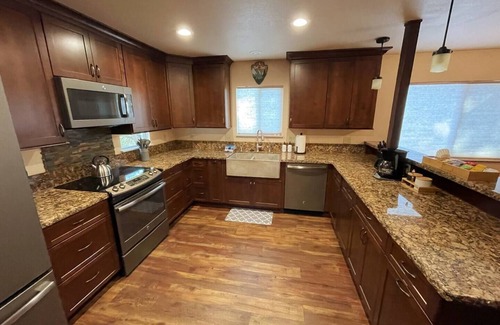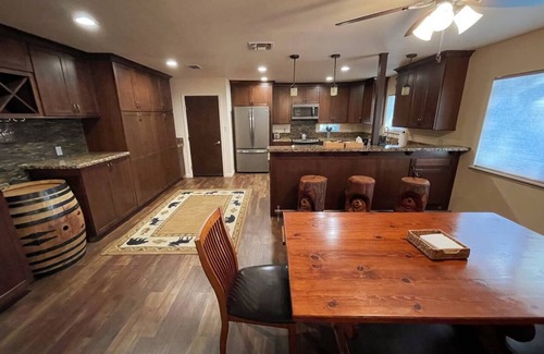 The 3 bedroom "Buckeye Bungalow" sits on a hillside with a great mountain view. It features a spacious kitchen, relaxing hot tub, classy wine bar, 4K Smart TV, high-speed internet, central AC/heat, and a peaceful fenced backyard area.