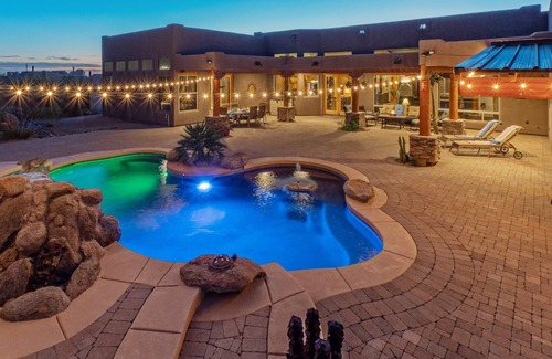 QUAIL MOUNTAIN VILLA, our luxurious, 4 BR, 2.5 BA, custom built, 3400 sq ft. single story home features a unique backyard oasis with spectacular mountain views and an abundance of wildlife to view right from the privacy of the back patio. Situated on 1.25 acres of land, it provides a quiet, private, tranquil retreat in a desert mountain setting. An elegant and covered front porch with comfortable seating is a favorite place for watching the beautiful Arizona sunsets.