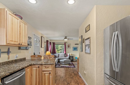 Step inside and unwind in the cozy living and family rooms, prep meals in the fully stocked kitchen, and enjoy your morning coffee on the covered porch surrounded by towering spruce trees. With laundry and WiFi, this cabin also works great for longer stays or those mixing business with pleasure.