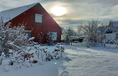 1-4 people can comfortably enjoy their holiday near the North Sea in the 48 sqm on the 1st floor. You have your own entrance with a wooden staircase upstairs. Bedroom with large double bed (1.80 m x 2.00 m), please remember to bring a large bed sheet. 1 extra bed (1m x 2.00 m) In the living room there is a sofa bed (1.40m x 2.00 m). The living area invites you to an open kitchen with a cozy dining area. (Dishwasher, toaster, coffee machine, microwave). Living room with couch / sofa bed and armchair and a TV. There is a bathtub in the bathroom. There is a seating area for you in the garden. You are welcome to bring your own grill.