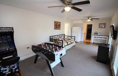 The upper level provides more bedrooms and master bedrooms and a bonus Futon bed in the game room. The upper level even provides an extra frig, microwave, laundry room, MORE bathrooms, and another deck over looking the lake..