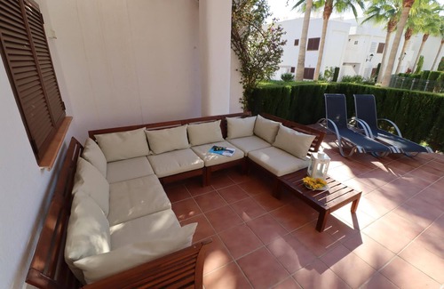 The accommodation offers a garden with gravel, a lawned communal garden with trees and a view of the mountains. Its comfort and the vicinity of the beach, places to shop, sports activities, entertainment facilities, sights and culture make this a fine apartment to spend your holidays in Spain with family or friends.