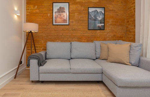 The intimate, modern apartment can comfortably accommodate up to 4 people. The 40 m² surface is divided into a living room with a double sofa bed, a kitchenette, a separate bedroom with a double bed, and a bathroom with a shower cabin. The panoramic windows face the courtyard, providing a sense of peace and quiet. The interior is finished in a minimalist loft style, with each element creating both a stylish and functional space. The functionality is further enhanced by extensive range of facilities and amenities. The amenities include multimedia (a flat-screen TV, and free Wi-Fi connection) and full bathroom and kitchen facilities, such as a washing machine and a dishwasher. For an easy beginning of a stay, complimentary cosmetics set, towels, and bed linen are provided. Guests travelling by car can park for free on a private parking spot in the gated courtyard.