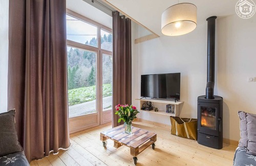 Individual house with 3 levels. Ground floor: entrance hall. 1st floor (access level from the road): kitchen-living room area, Internet connexion (Wifi or wired), 1 bedroom (1 bed 2 people), bathroom (shower), separate WC. 2nd floor: 3 bedrooms (3 beds 2 people), bathroom (bathtub), separate WC, large mezzanine with view on the living room. Terrace and playground. Private parking for 3 cars. Ski at Le Granier at 5 km, Planolet/St Pierre de Chartreuse at 10 km. Cross-country ski at Le Desert D'Entremont at 7.5 km. Individual renovated country barn located 5 km from the family ski resort of Le Granier. At the heart of the Entremonts Valley, in the Natural Regional Park of Chartreuse. Hamlet quiet on a Southeast facing slope. Very comfortable and spacious. Large fitted mezzanine space for games. Contemporary and mountain chalet style. Large terrace with access to the land, bordering a small river. Clear view of mountains.