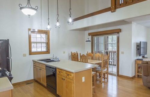 Connected by an inside lock-out door is the two-bedroom side of lodge 119. On the main level of the two-bedroom side is the kitchen, dining area, living room, screened-in deck, and one bedroom. The kitchen includes a full size refrigerator, oven, stove, microwave, dishwasher, garbage disposal, coffee maker, toaster, and a bar with three stools. The dining room has a table and six chairs and has access to the screened in deck which has four chairs and a table. The living room has a queen size sleeper sofa, two arm chairs, wall-mounted LCD HD television, cable TV, DVD player, wireless internet, and a fireplace for the winter months. The lower level bedroom is a master suite with a king size bed, LCD television, cable TV, and an attached bathroom with a large whirlpool tub and a separate shower. The upstairs has an open loft with bunk beds and a sitting area and also has a second master suite with a king size bed, LCD television, cable TV, and an attached bathroom with a large whirlpool tub and a separate shower.