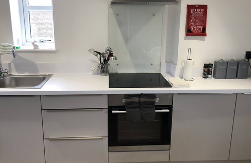 Spacious light and airy whole apartment. Complimentary WIFI. Full kitchen facilities, cooker, microwave, kettle, complimentary tea, coffee, sugar. Fridge, freezer. TV. Open plan lounge with double sofa bed area. Shower room and WC. Double bedroom, double bed. Walk in wardrobe. Heating included. Lovely modern apartment. Great location, near to train station, motorways. Nearby supermarkets, park facilities, eateries and the town.