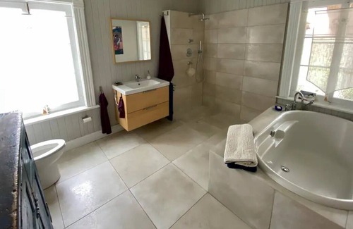 This 4-bedroom, 2-bathroom rental features a living room, a dining area, a BBQ grill, and a desk. Bathroom amenities include a hair dryer, towels, and toilet paper. The kitchen is equipped with an oven, a stovetop, and a refrigerator, as well as a coffee maker, a microwave, and cookware.
