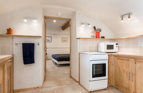 The ground floor is open plan with a custom built vaulted kitchen, stairs to upstairs and a further vaulted lounge/dining area. The downstairs bedroom is very large and has a double bed which converts into two single beds and an en-suite shower room. There is a door to a small gravelled garden with table and chairs. The upstairs bedroom is spacious and houses a double bed with a shower, wash basin and WC en-suite. There is a child gate at the top of the staircase. Both bedrooms have plenty of space for a baby's cot. La Petite Grange has 1 metre thick walls and so is very temperature neutral throughout the year.