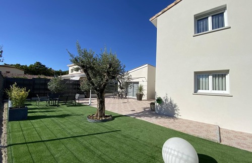 A special touch has been added to the decor of each room; you'll be charmed by the murals! It's the ideal place for your vacations with family or friends, or for your business trips; everything is equipped for peaceful remote working and also for organizing seminars! The house is located 1.6 km from the town center of Cugnaux (all shops). 4.3 km away: the La Ramée leisure center with a lake, golf course, and walks. 10 km away: Muret, Aqualudia water sports and games complex. 6 km away: African Zoo de Plaisance du Touch. 17 km away: Toulouse city center, which you can reach by train (Portet-sur-Garonne station is 7 km away) or by taking the metro from Basso Cambo station (car parking at the station). The entrance opens onto the games or seminar room (pool table that can be transformed into a ping-pong table or seminar table), WC with washbasin, very large living room with integrated kitchen, dining area and lounge area with wood stove, this living room opens onto the large terrace where you can enjoy either the Spa, the relaxation lounge or the garden furniture to take your meals outside (plancha and pizza oven). Two duplex bedrooms with each on the ground floor a sofa bed for 2 people and an office, upstairs a bedroom (1 bed 160cm for 2 people), a separate toilet, a shower room. A large bedroom accessible from the ground floor of a duplex, composed of a separate toilet, a shower room, the 25m² bedroom with 1 bed 180cm for 2 people and a lounge area. Accessible from the outside, the 4th bedroom (35m²) features a sitting area, a 180cm double bed, a desk, a bathroom, and a separate toilet. LEGRAND reinforced socket for electric vehicles (3.2 kWh). Parking area in front of the cottage. Outside, reserved for the house: right of way along the edge of the house to access a year-round rental at the back of the property.