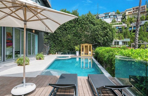 Perched in the coveted Hollywood Hills, this recently renovated 5-bed, 3.5-bath smart home marries tech and tranquility with Control4 automation, sleek smart toilets, a private outdoor sauna, and beautiful pool and jacuzzi. Gaze out at the glittering city skyline from expansive terraces. Blending modern opulence with serene hillside living, this architectural gem is professionally managed by Stay Awhile Villas.