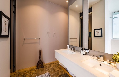 The living space & kitchen will make you feel like back home with all the needs you require. The high ceilings, the glass doors, the art and decorations will bring you back to the luxurious amenities you get normally in the city but with the serenity of Costa Rica. All areas connected to each other, and with the possibility of opening all windows and connect the exterior with indoor.