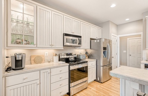 Inside your home away from home, rest assured that everyone will be content and comfortable as the living quarters are spacious, updated, and evoke feelings of warmth. In the living room, find yourself lounging on the ample plush seating while taking in glorious lake views. Perfect for movie nights, this space also boasts a large TV. The full kitchen makes cooking easy with its suite of stainless steel appliances, ample meal prep space, and charming, formal dining table.