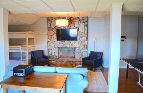 Open concept great for multiple families with a separate kids’ space; fun and relaxation for everyone. Fireplaces are wood-burning. The downstairs’ open space has a living area, sleeping area, Ping-Pong table, bathroom, and walkout access to the lake. Downstairs has 2 sets of bunk beds, a separate single bed, and a queen sleeper sofa. All upstairs bedrooms have king beds to make sure everyone’s stay is comfortable. The owner’s suite has an on-suite bath. We care about comfort and know that not all vacation rentals invest in mattresses- we did!