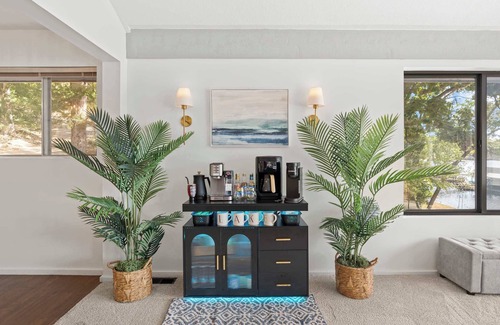 Step inside and settle into the spacious main living room, where a large wraparound couch faces a smart TV and sliding glass doors that frame stunning lake views. Step out onto the balcony to sip your morning coffee at a high-top table for two, or simply relax and take in the beauty of the water. The fully equipped kitchen boasts stainless steel appliances, counter seating, and a charming coffee station with both Keurig and drip options, while the dining table for six makes gathering together a breeze.