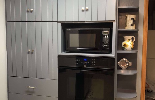 Well equipped kitchen, including Instant Pot, air fryer, blender, griddle, electric skillet, toaster oven, Keurig and coffee pot. Decent knives, wooden utensils and Hexclad non-stick pans. Plenty of dishes, utensils, baking pans, and cooking tools. Spices and basics like sugar, flour, salt, cooking oils and vinegars.