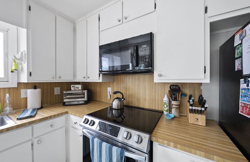 Kitchen: We stock the kitchen with everything you need to cook, including a wide variety of pots and pans, crock pot, ninja blender, baking sheets, toaster oven, cooking utensils, oils, basic seasonings, honey, tea, sugar, coffee beans, and a grinder. Abundant glassware options, plastic cups, plates, bowls for the kids, ziplock baggies, parchment, foil, and plastic wrap are also provided. Wooden table with expandable leafs works great as a kitchen island or as an extra dining space.