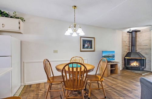 The cozy kitchen area is well-appointed with a full-sized refrigerator, oven, dishwasher, standard drip coffee pot, microwave, and toaster, plus a dining table. The living room has a sleep sofa, a recliner, and a fireplace, and is a great spot to cozy up on a cool evening. Step outside to the deck where you can relax and enjoy the peaceful surroundings.