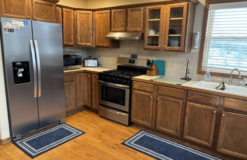 Three levels each with a bedroom. Lower Level - Recreation room, ( double futon ) bedroom ( queen ) and garage. Mid Level - Bedroom ( queen ) bathroom, grand room, kitchen, living room, dining room, fire place. Outside deck. Upper Level - Master Bedroom,( queen ) master bath, fire place, study. We furnish linens and towels, a full kitchen and a safe, clean, healthy place to lay your head.