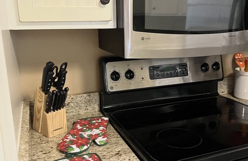 The kitchen has been fully remodeled with granite counter tops and alll stainless steel appliances! It has a small dining room with a table that seats 4 and a bar that seats 2 more. However, there is also a table out on the covered deck overlooking the lake that can seat 4-8. It has 4 chairs and 4 stools, if you will—so can seat up to 8 if needed. Many families choose to divide up with 4 in dining room off from kitchen and 4 out on the deck..or set it up kids and adults tables! It is a very good set up for a family or even a couple of families! Because it is out in the woods and on the lake front row—please do not leave food out on counter tops as this invites ants to come in then for food…and please do be aware since in the woods—there may be an occasional spider or web no matter how much it is cleaned and even with our pest control. It is surrounded by trees—when look out from terrace level like being in a tree house as trees all around you and the lake!——speaking of terrace level…