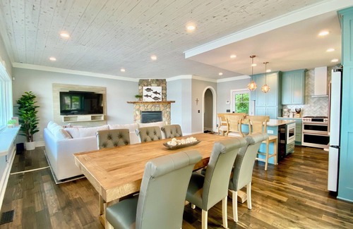 Nestled on the shores of Lake Pulaski in Minnesota, our stunning retreat offers a picturesque beach with chairs near the water. Two docks invite you to soak in lake life. Inside, enjoy a well-equipped kitchen and a dining table for six. Relax in the cozy living room with a TV, or step out onto the wrap around decks on both levels. Upstairs, the master bedroom offers a breath taking view of the water, a luxurious sauna, and bathroom with a soaking tub and spacious shower. The lower level features a cozy area with board games, a cool blue couch that seats many, and a TV. With ample sleeping arrangements, including king and queen beds, and a twin bed, plus great fishing, it's a wonderful getaway spot