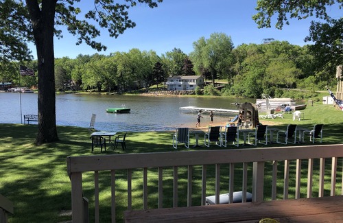 Perfect location for guests who are worried about Covid-19. Only 8 condos in the Resort which allows for open spaces and limits total number of renters. Enjoy the lake view on our large deck that easily seats 6 guests. Golf and fishing are open! Take advantage of our no wake zone bay with private beach, row boats, pool, outdoor fire pit and more. Docks are available for private boats or rent a pontoon for daytime fun. Option to visit the endless attractions in the Wisconsin Dells, the World's Largest Water Park!
