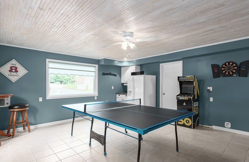Inside, Kosh Kottage features a spacious living room, a fully equipped kitchen, and a dining area with beautiful lake views. The additional living spaces include an extra kitchen area, 3 bedrooms and a bunk room, and a laundry room, making it perfect for families or groups. The game room, complete with a ping pong table, shuffleboard table, dart board, and an arcade game, promises fun for all ages.