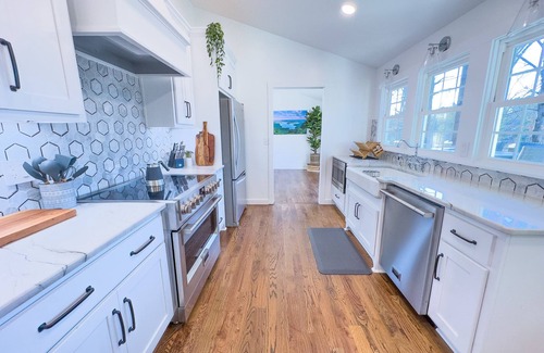Fully stocked kitchen has an open layout to the living room. Equipped with stainless steel appliances, an induction cooktop, and tons of counter space. You won't need to bring a thing, we have pots, pans, plenty of dishware, flatware, a kettle, spices, cooking oil, etc. All grilling utensils are located underneath the microwave.