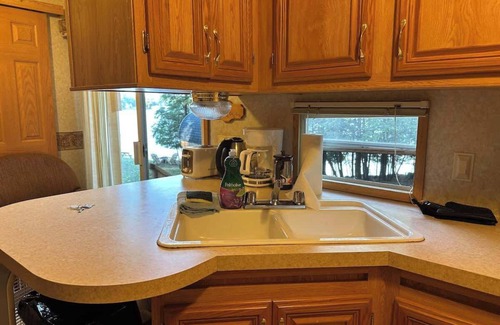 Step inside this charming lakefront RV cottage and discover a thoughtfully designed space perfect for a relaxing getaway. The camper features two cozy bedrooms, each offering a private retreat. The first bedroom boasts a comfortable queen-sized bed, promising a restful night's sleep. The second bedroom is equipped with a bunk bed, ideal for children or additional guests. The full bathroom provides all the necessary amenities for your convenience. The living area offers a welcoming space to unwind after a day of exploring the surrounding natural beauty. The kitchen is equipped with essential appliances, including a refrigerator, microwave, and kettle, allowing you to prepare your favorite meals. Enjoy the convenience of a dining table, perfect for sharing meals with loved ones. Outside, a BBQ grill and fire pit provide the perfect setting for outdoor cooking and enjoying the serene lakefront ambiance.