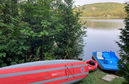 Chalet on a private estate with 3 bedrooms and 2 bathrooms in Saint-Côme by Lake Côme, 10 minutes from Val St-Côme ski mountain, snowshoeing trails, hiking, and snowmobiling, private waterfront on a non-navigable lake, indoor propane fireplace, outdoor wood fireplace, brick wood oven, WiFi, TV, video games, Sonos sound system, 2 Queen beds, 1 double bed, and 2 single bunk beds, washer-dryer, paddleboard, canoe, pedal boat, no pets allowed, 2 gazebos, tennis court, the chalet offers an unbelievable view of the mountain, with breathtaking panoramas that change with the seasons. Whether it's in winter when the peaks are covered in snow or in summer when the greenery bursts under the sun, the natural beauty of the mountains is simply incredible