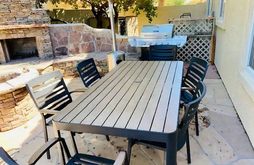 Enjoy dining in the outdoor kitchen area with a grill and both a fireplace and fire pit. Wifi, games, family friendly and pet friendly. Come relax or bring your party here to make memories. Welcome home!