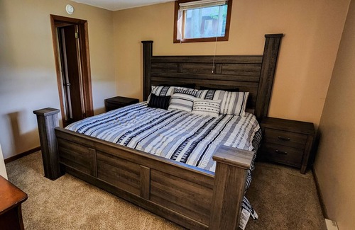 The basement floor (with ground-level,rear access) puts you right in a rustic setting with brand-new pine walls and ceilings. 2 additional bedrooms, another full bath, and 2 of the bedrooms have bunk beds along with a queen. The spacious game room includes a pool table, poker table, a sitting table, and a drink refrigerator. The 65" flat-screen TV can be used to watch sports, TV, gaming, or your favorite movies! The level opens up to a patio with a hot tub, fire pit, and more seating.