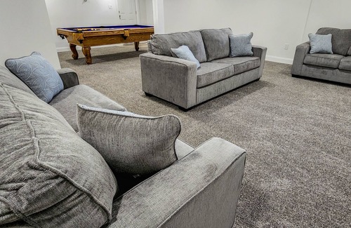 The spacious game room includes a pool table, foosball table and dart board, and a small drink refrigerator. The 65" flat-screen TV can be used to watch sports, TV, gaming, or your favorite movies! The level opens up to a patio with a hot tub, fire pit, and more seating.