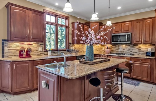 -Fully equipped chef’s kitchen with granite countertops, stainless steel appliances, and coffee bar