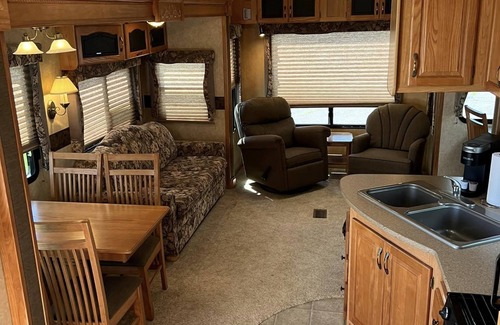 Flexible check-in/out days with long, extended and short stays welcome (2 night minimum) for our Lakeside 5th Wheel. Our fully furnished lakeside 5th wheel features a Kitchen, dining table, sofa sleeper with new memory foam mattress, King size Master, lakeside deck, heat, air conditioning, cable television and free Wi-Fi. Book a vacation that fits your schedule! With only a two night minimum required, you can check-in on any day of the week. We also have kayaks available for rent for those beautiful fall days ahead to get out on the Lake and enjoy the fall colors!! Swim platform and beach are steps away from the camper!!