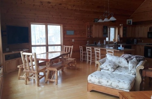 This cabin is a retreat for summer, fall, winter and spring. From 4 wheeling, boating, swimming, water skiing, fishing, snowmobiling, hiking, cross country skiing or enjoying the seasons. We are in the scenic road guide to see the fall colors. Our 4 bedroom sleeps 12. Two king bedrooms, one queen bedroom, two bunk beds and common area queen inflated mattress sleeps two. The open floor plan on the main level is a perfect area to gather together for meals and relaxing.