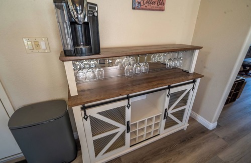 The kitchen is equipped with all the essentials. You'll find a radiant top range, dishwasher, microwave and refrigerator with filtered water and ice. Cooking and dining utensils stock the drawers and shelves. There is also a pantry to store your food supplies. In the adjoining dining room, you'll find a dining set for six, a coffee bar with a Keurig, along with extra mugs and wine glasses.