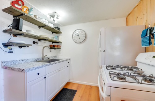 KITCHEN: Well-equipped w/ cooking basics, spices, drip coffee maker, dishware & flatware, full knife set, microwave