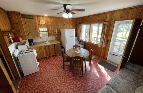 This cabin is located at Green Valley Resort on Seventh Crow Wing Lake. It has a lake view, open kitchen and living area with a sofa, large shower, window A/C and ceiling fans. We have an on-site lodge with books, games, and snacks; dock space for your boat; and boats for rent too. Come enjoy beautiful sunsets, great fishing, and relaxing in nature at our family-friendly fishing resort! We hope to see you soon!